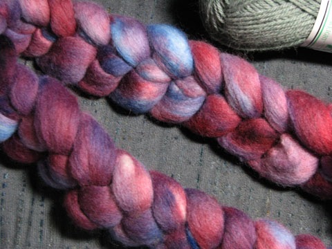 This is what it looks like to start with. Fiber or fiber blend that’s been combed, i.e., all the strands of fibers are lined up neatly. Then it’s hand-dyed, dried and braided for sale. The finished yarn product is going to show the color differently, depending on how it is handled/spun. Remember playing with water paints when we were kids? If you mixed all the colors together, you just ended up with an ugly brown color? Well, that’s part of Advanced Color Theory, but depending on how these are spun, they’ll all lose their brightness and end up looking dull and muddy. OR you’ll retain the colors that originally attracted you to the braid and the dye artist.