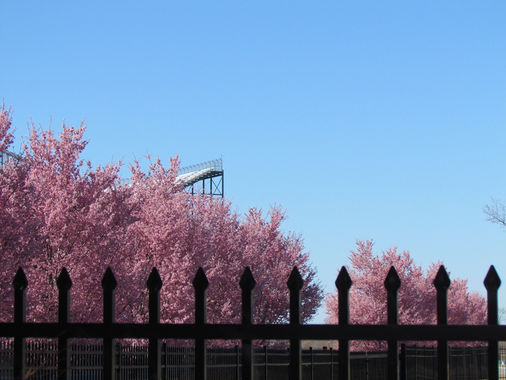 And I also got these pink ones on some trees off the road that comes off the highway and goes back around the track (Dover Downs). I liked this shot showing both full flowers and buds in various stages of growth.