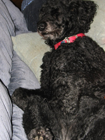 Digging through the picture files on my camera chip and came across this. I have a poodle who has a very good life – better than mine actually, except for that “public pooping out in the cold” part. The biggest responsibility she has is deciding whether she’ll sleep on the couch or on the waterbed, and this is usually determined by the indoor temperature. If it’s warm in the house, she opts for the couch; if it’s colder, she goes in on the heated waterbed. This was taken on a warm day. I took 6 shots with the flash before the damn dog woke up. I feel so much more secure knowing this dog is in the house when I’m here alone. Flat on her back with her legs sprawled wide and comfortable.