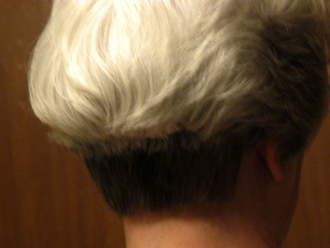 But what I’ve found out is that, for some odd reason, the hair that grows at the nape of my neck is still DARK!! And I’m not sure why, and there’s nothing I can do about it. When I went in for a haircut today, I told Laurie, my hairdresser, that I think I want to go back to the longer style, as it was a year ago and I’m not so sure about the white, either. But I wanted her to start angling up the back again, and letting the top grow.